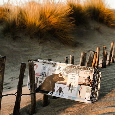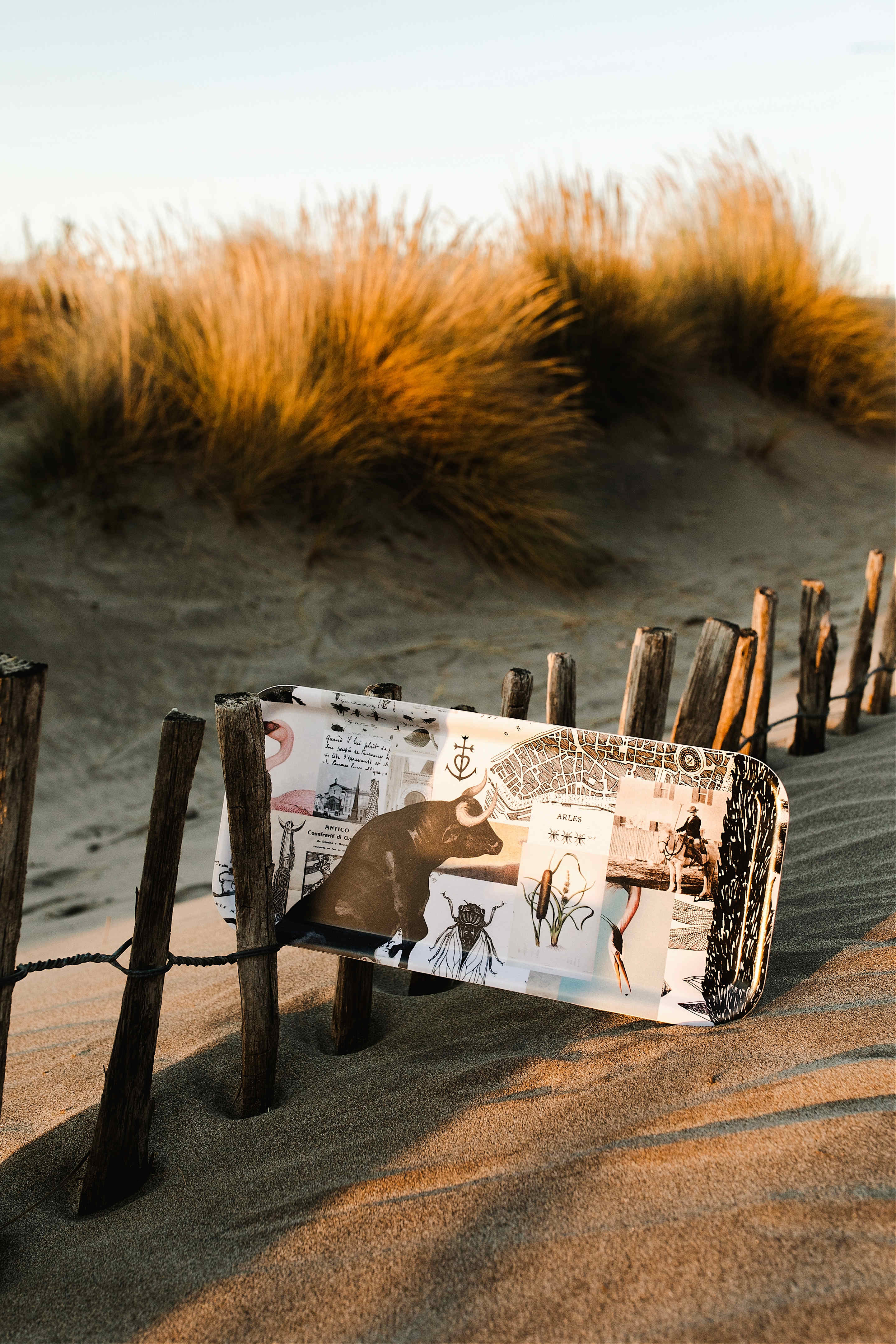 C'est un plateau format plat à cake qui mesure 32 x 15 cm (il existe aussi en grand et en petit format). L’illustratrice Roxane Lagache a créé ce collage arlésien pour MOUSTIQUE, en jouant avec le flamant rose, le taureau, le plan d'Arles, l'Arlésienne, Saint Trophime, les colonies du Théâtre antique, le plan de la Camargue, des moustiques... Le motif a ensuite été imprimé en Grande Bretagne, exclusivement pour notre boutique, sur des plateaux en bois de bouleau fabriqués en Suède.