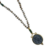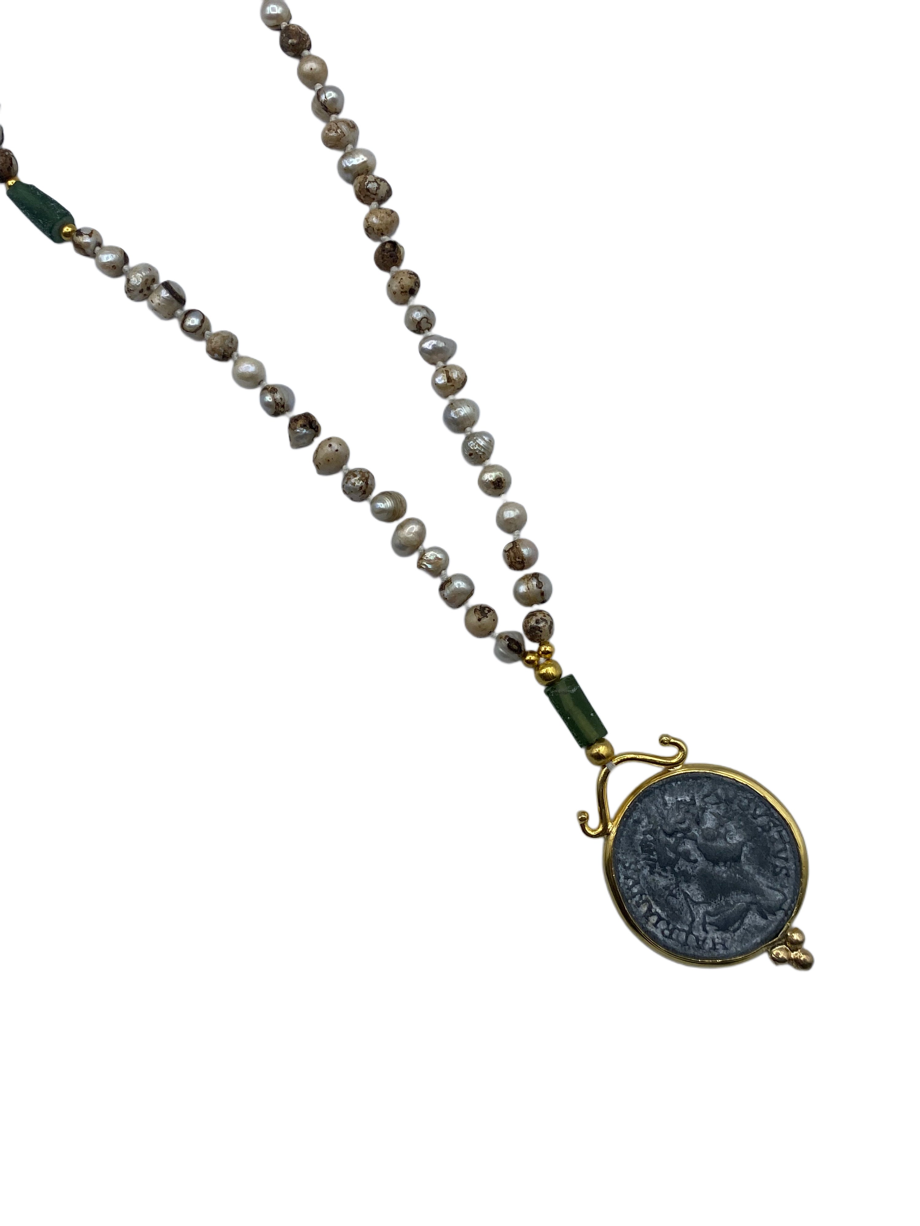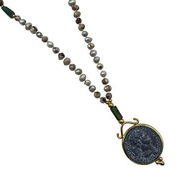 Ce collier est composé d’un rang de perles nacrées finement sélectionnées, sublimées par une fermeture en T dorée au style antique. En pendentif, deux médaillons circulaires imitant des pièces historiques romaines ou byzantines sont encadrés de montures dorées travaillées à la main, reliées par des maillons décoratifs.