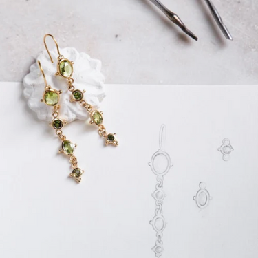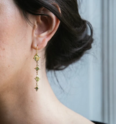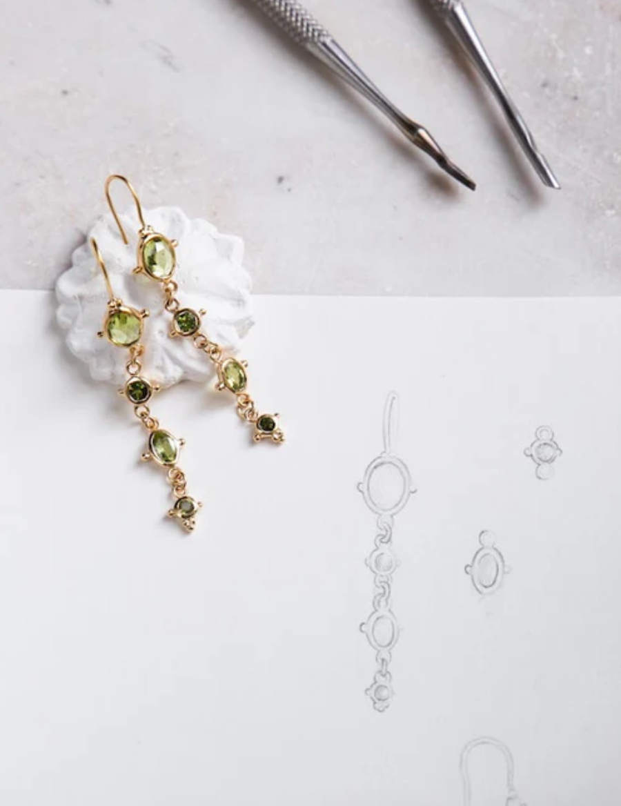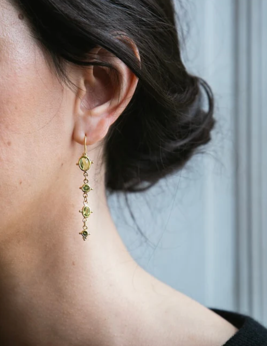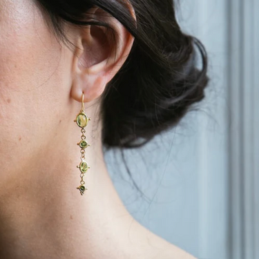 Les boucles d'oreille Léonie en vermeil (argent plaqué or 5 microns), tourmaline verte et péridot.
