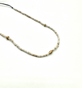 Ce collier se compose perles blanches et de pièces de laiton, enfilées sur un fil de coton noir.