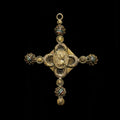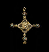 Les Croix sont de tailles et de compositions différentes. Aucune ne se ressemble. Celle-ci, composée de laiton doré, porte en son coeur le portrait ciselé d'une jeune fille de profil. Tout autour, il y a un travail du métal extraordinaire et 4 perles de verre coloré. Une pièce merveilleuse. Le ruban de velours noir mesure 60 cm de hauteur déplié. La croix mesure 10 x 8 cm.