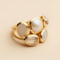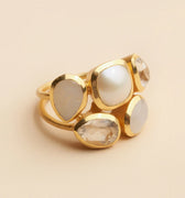 La bague Fia à la fois élégante et sophistiquée est en laiton incrusté d'or 18 carats et ornée de pierres de Lune arc-en ciel.
