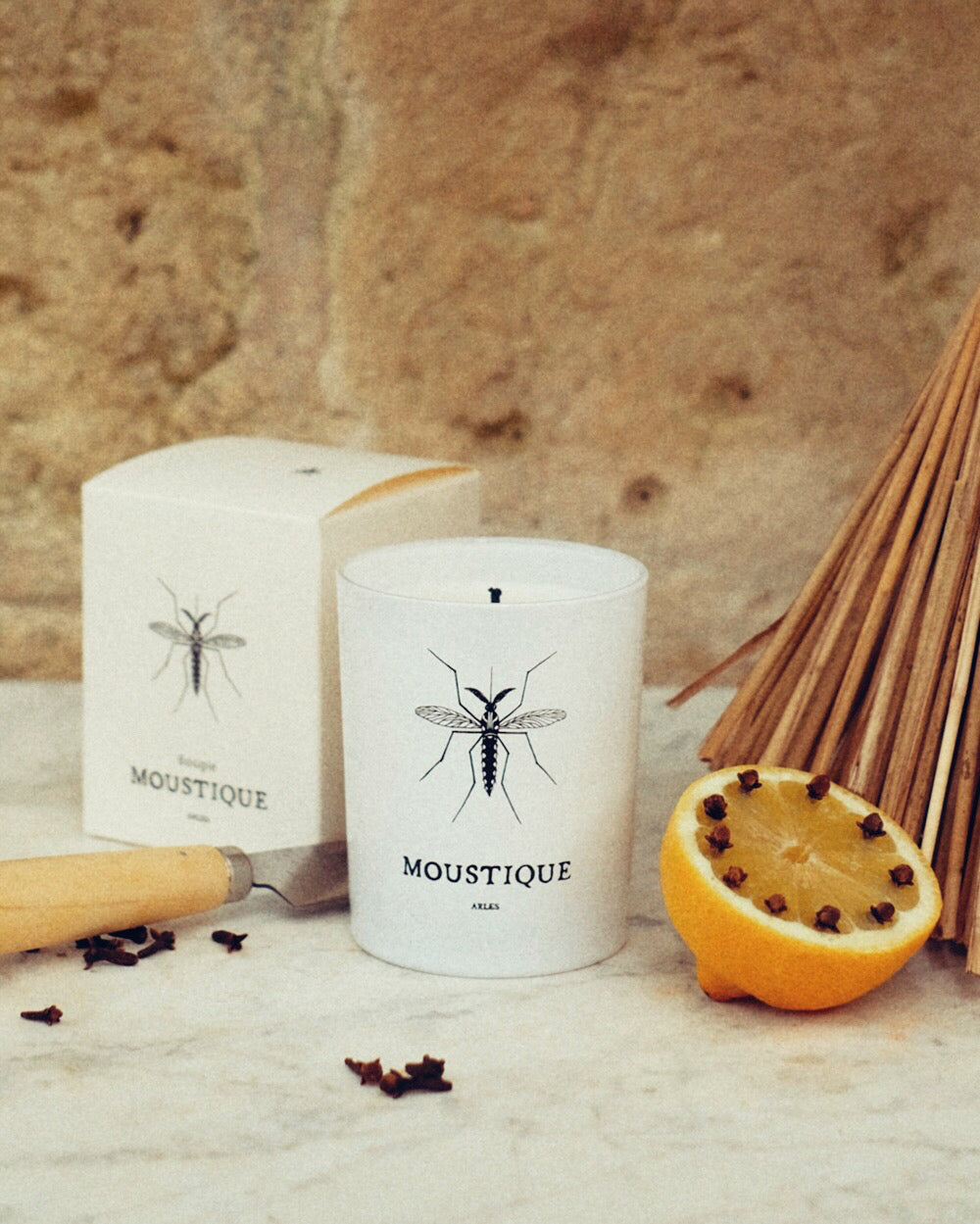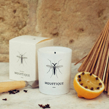 La bougie originelle Moustique se présente dans un verre blanc estampillé de notre logo. Elle pèse 180g et se présente dans une boite mesurant 9,5 x 7,5 x 7,5 cm.