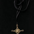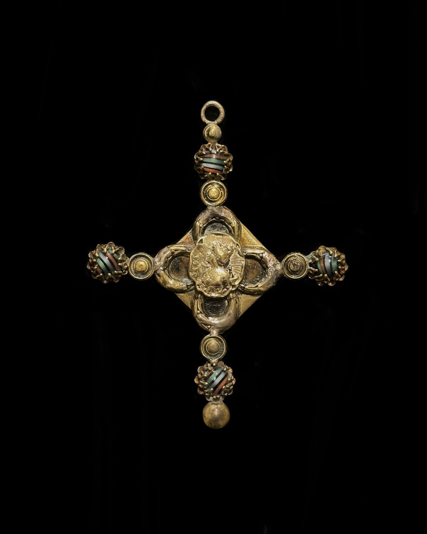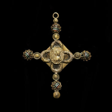 Les Croix sont de tailles et de compositions différentes. Aucune ne se ressemble. Celle-ci, composée de laiton doré, porte en son coeur le portrait ciselé d'une jeune fille de profil. Tout autour, il y a un travail du métal extraordinaire et 4 perles de verre coloré. Une pièce merveilleuse. Le ruban de velours noir mesure 60 cm de hauteur déplié. La croix mesure 10 x 8 cm.