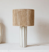 La lampe Halo est émaillée en blanc mat kaolin. L'abat jour est tissé à la main en corde de coton ou jute.