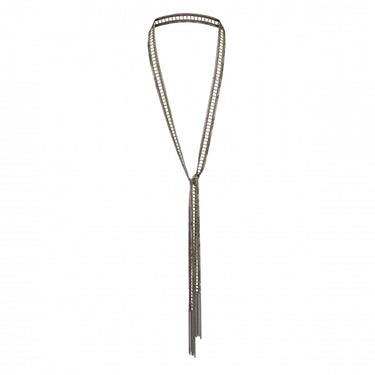 Ce collier cravate en bronze blanc, scintillant, mesure 120 cm de long déplié. Il se termine par de longs pompons de chaines (6 cm). Il peut se porter en tour simple ou en écharpe. Il s'accorde au bracelet assorti.