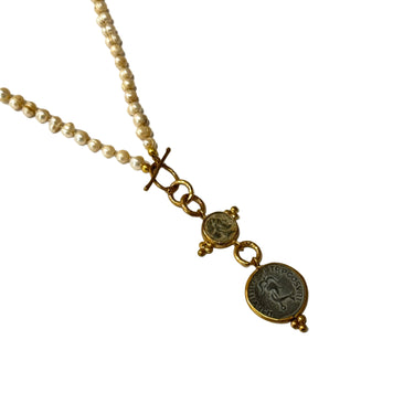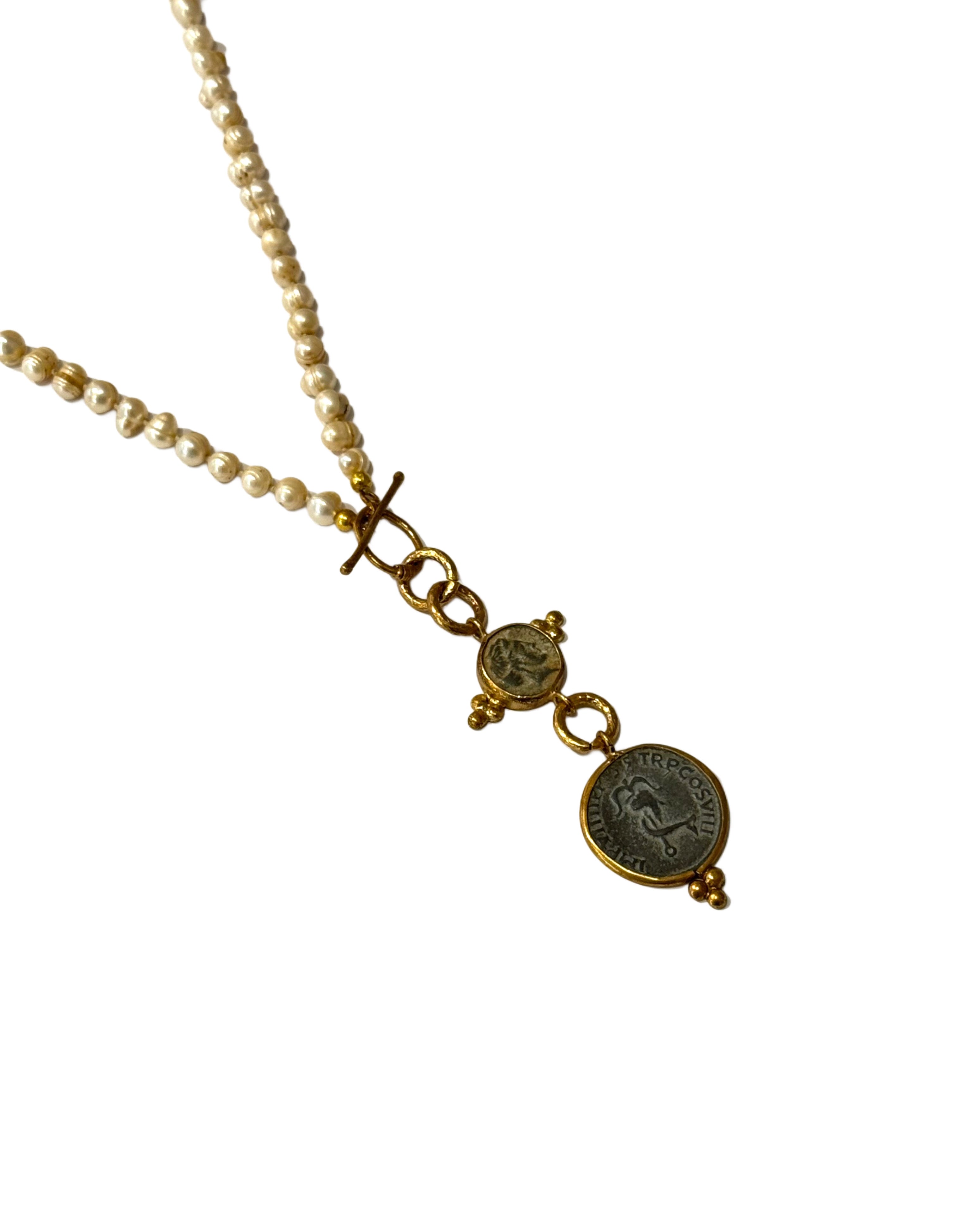 Ce collier est composé d’un rang de perles nacrées finement sélectionnées, sublimées par une fermeture en T dorée au style antique. En pendentif, deux médaillons circulaires imitant des pièces historiques romaines ou byzantines sont encadrés de montures dorées travaillées à la main, reliées par des maillons décoratifs.