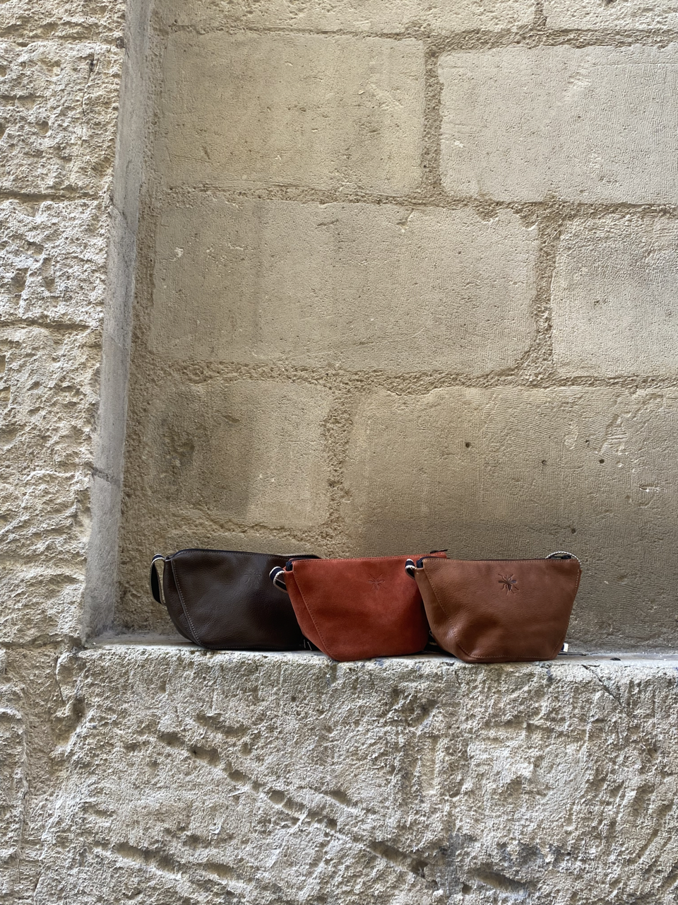 La maroquinerie Bandit Manchot pour Moustique est fabriquée en France à partir de cuirs issus de grandes maisons de couture. Ces peaux, dites de « post collection », sont sélectionnées par des stylistes puis écartées, souvent pour des raisons commerciales. Matières exceptionnelles, elles dorment alors sur des étagères avant d’être détruites. Bandit Manchot les rachète pour leur donner une deuxième vie, en concevant des pièces uniques. Moustique a choisi les cuirs dont les teintes, le toucher et le grain évoquent la Camargue.