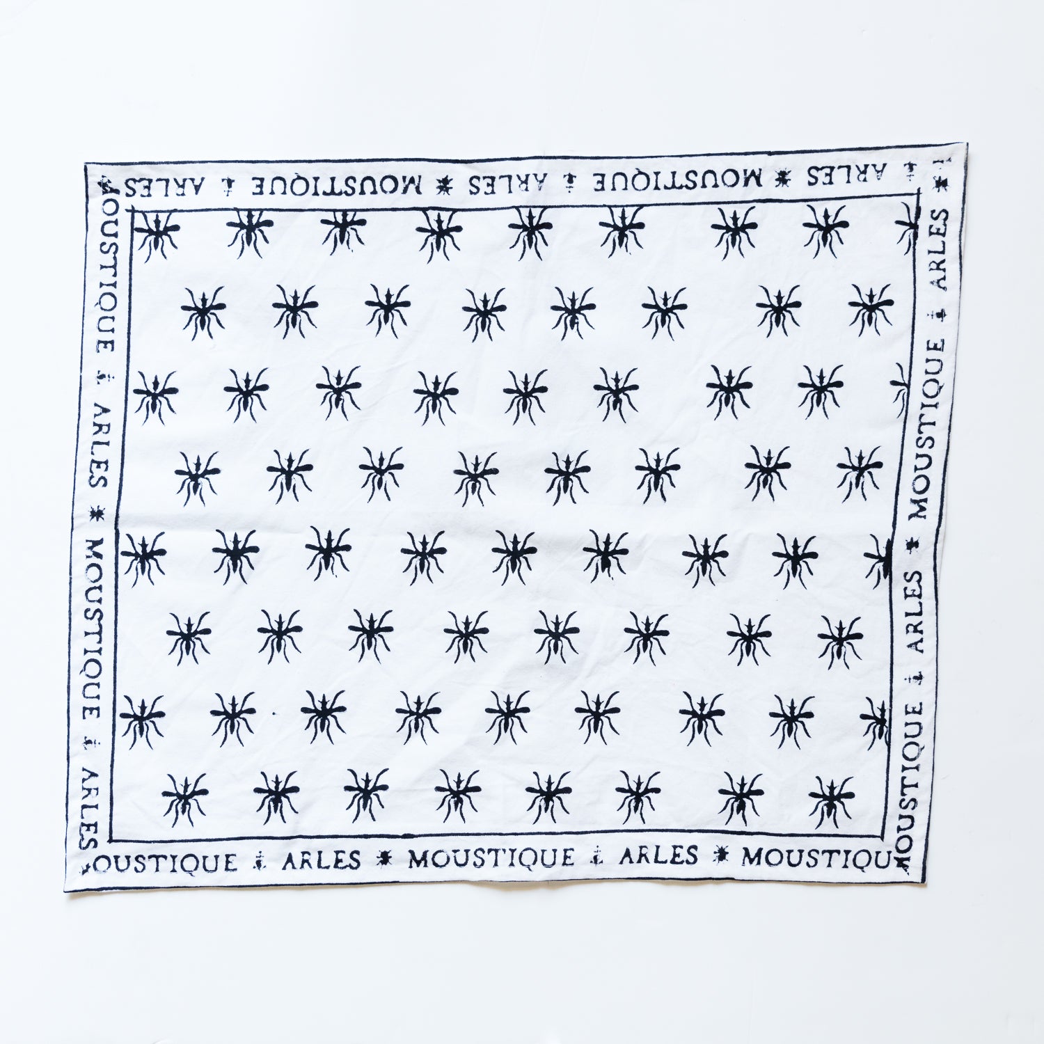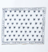 Cette serviette en voile de coton est imprimée d'une nuée de moustiques. Elle mesure 50 x 40 cm.