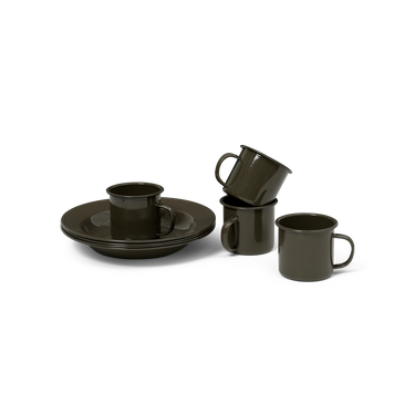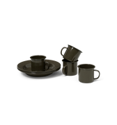Ensemble de quatre assiettes et quatre mugs en métal pour des tables champêtres en intérieur ou des pique-niques chics.