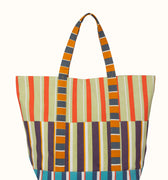 Le beach Bag est un sac en toile de coton, doublure coton reprenant les rayures grises et oranges. Il dispose une pochette intérieure zippée et d'une poche extérieure ouverte . Il mesure