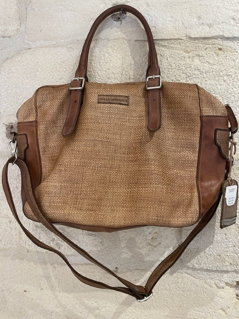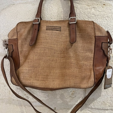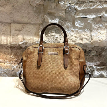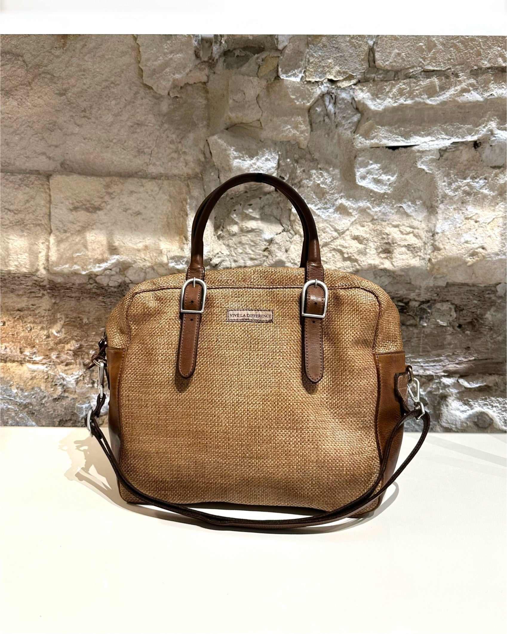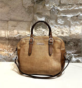 Ce modèle est en paille cirée, en cuir de veau avec une doublure en tissu pied de poule. Il présente une poche intérieure avec fermeture doublée en toile et zippée, et une autre en cuir surpiqué pour y placer un smartphone. La bandoulière ajustable mesure 60 cm. Les dimensions du sac sont 26 x 30 x 12 cm. Le tout fabriqué en Italie.