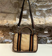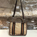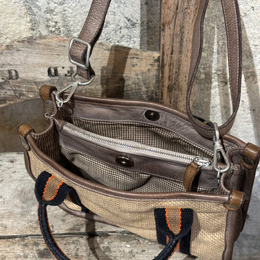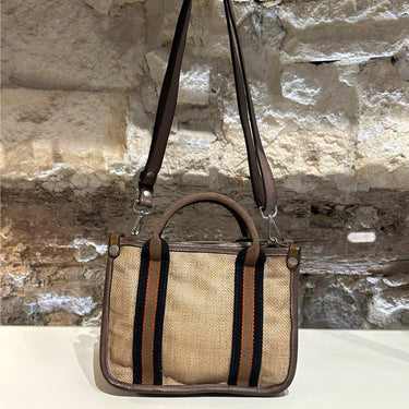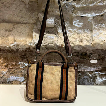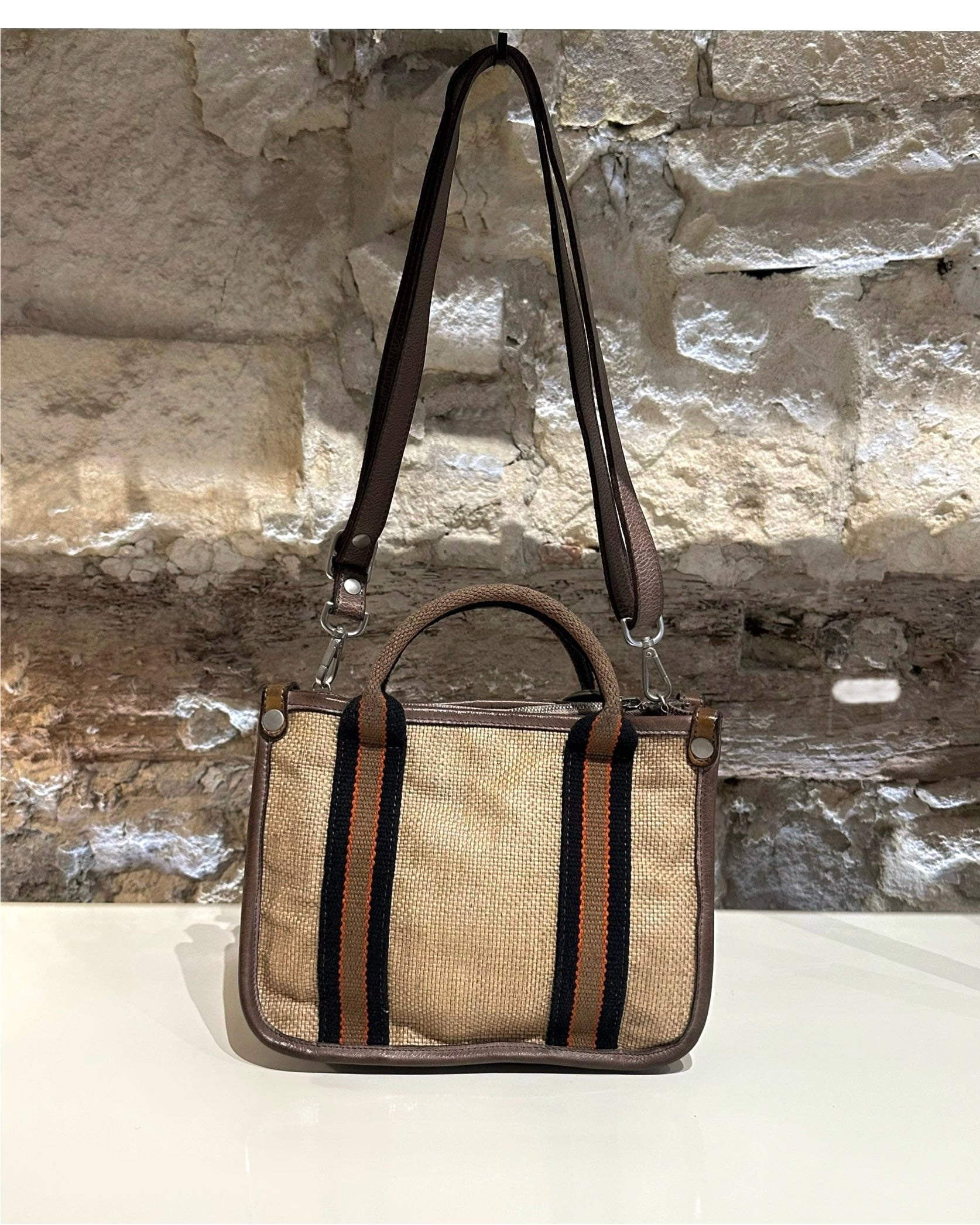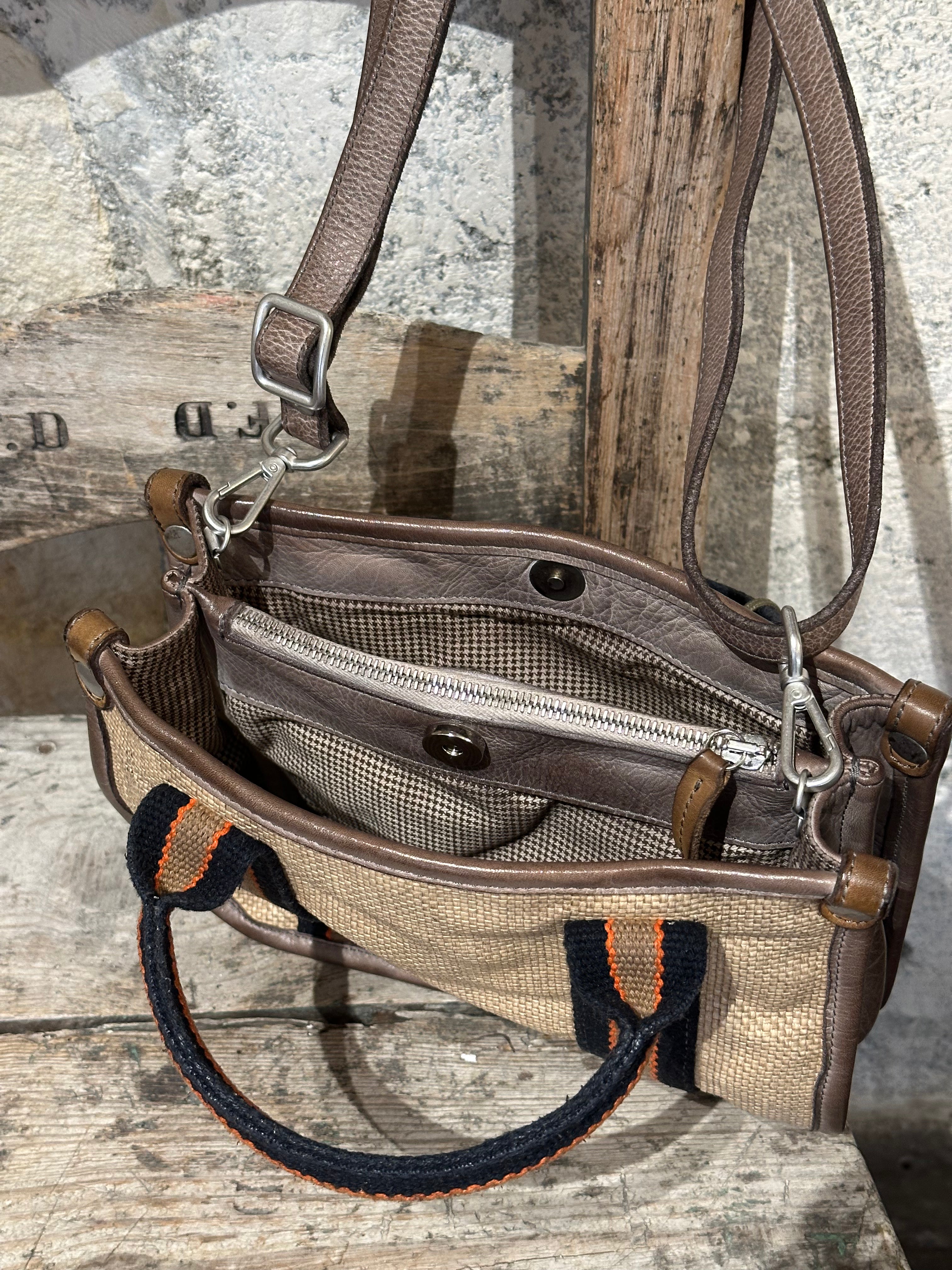 Petit sac en paille tressée de fermant par pression , cloison centrale zippée, intérieur doublé en tissu pied de poule marron Sa bandoulière est amovible ajustable. Il mesure L26 x H20 x P 5 cm. Il a été fabriqué en Italie.