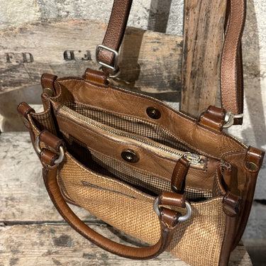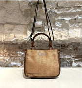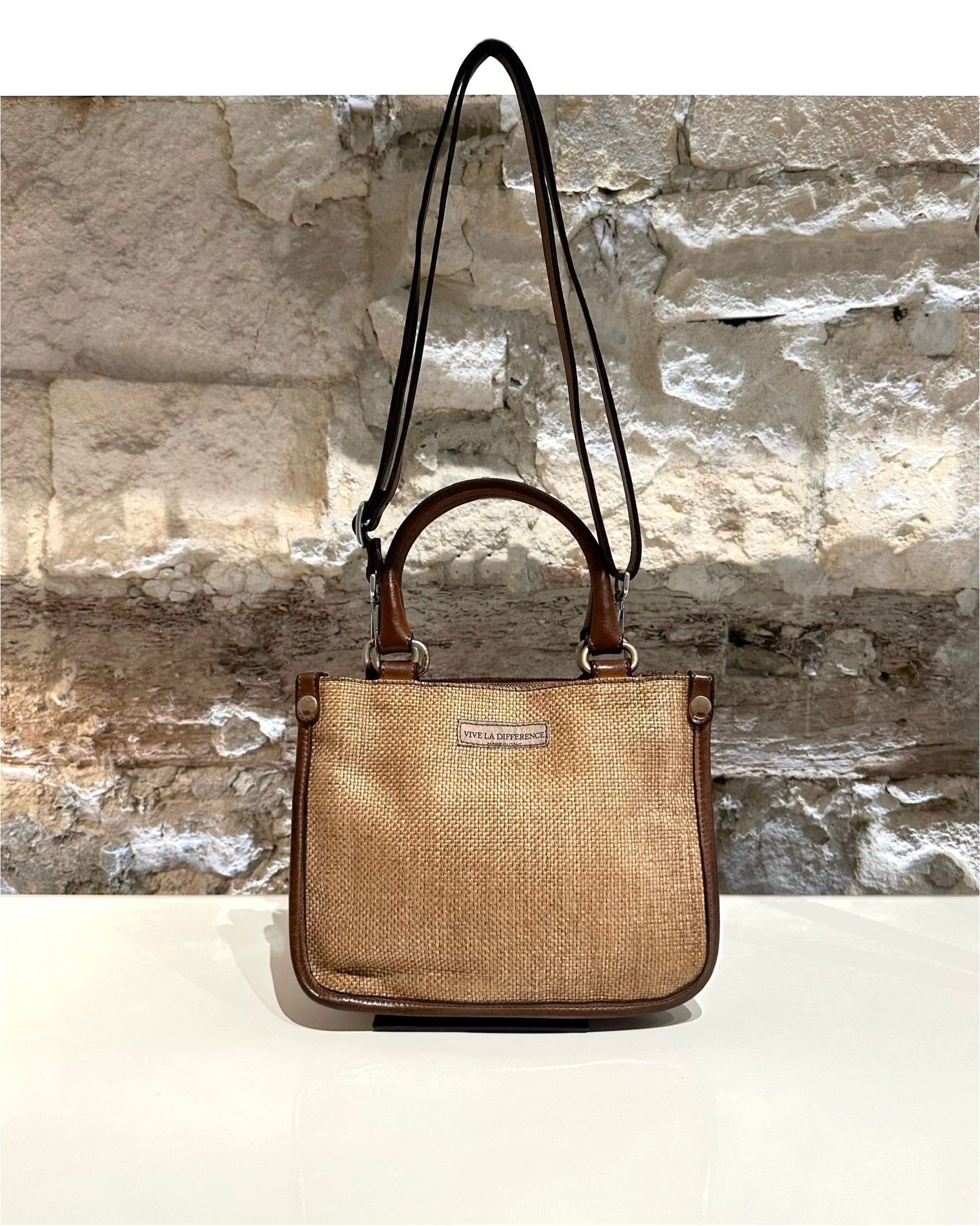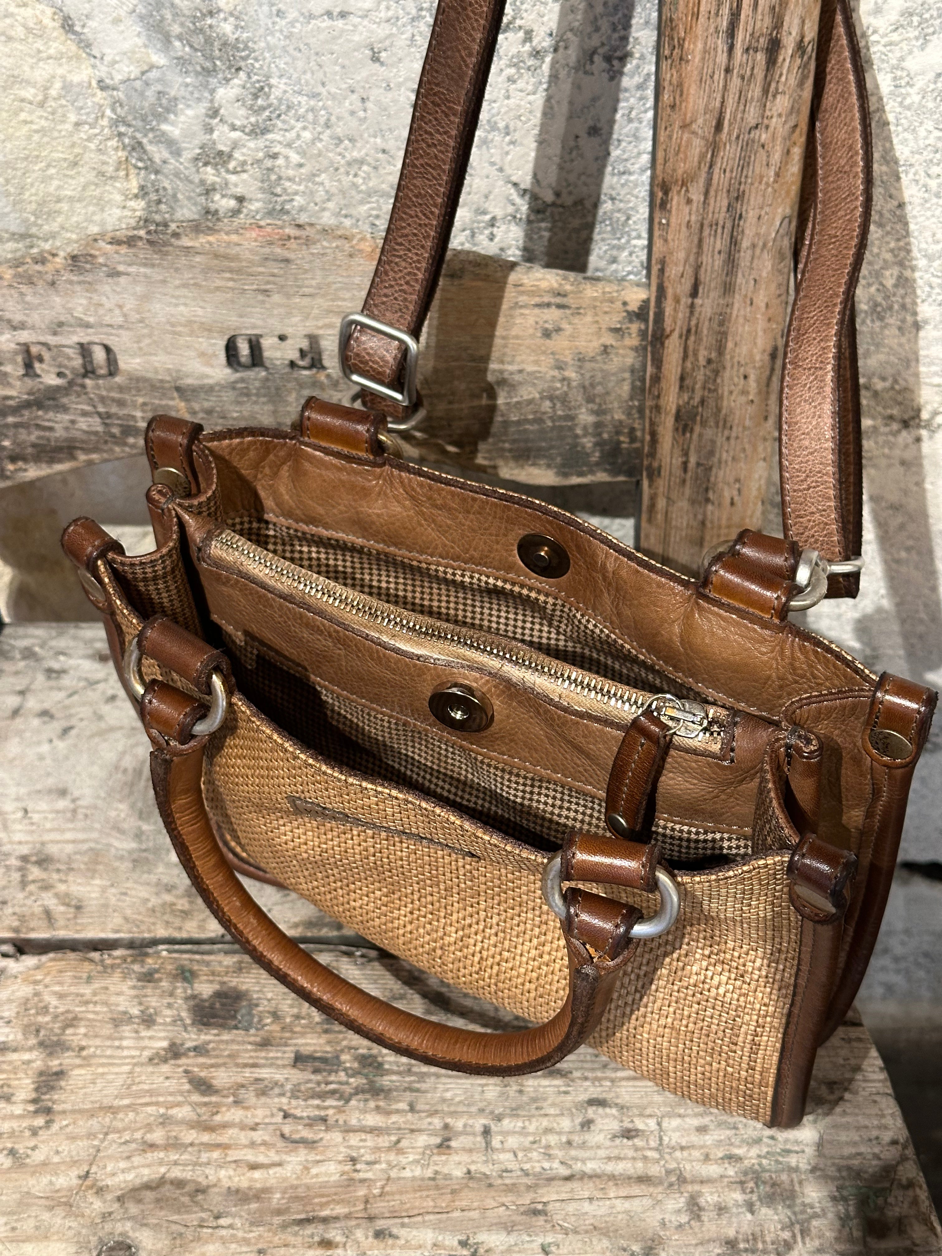 Petit sac en paille tressée de fermant par pression , cloison centrale zippée, intérieur doublé en tissu pied de poule marron Sa bandoulière est amovible ajustable. Il mesure L26 x H20 x P 5 cm. Il a été fabriqué en Italie.