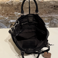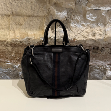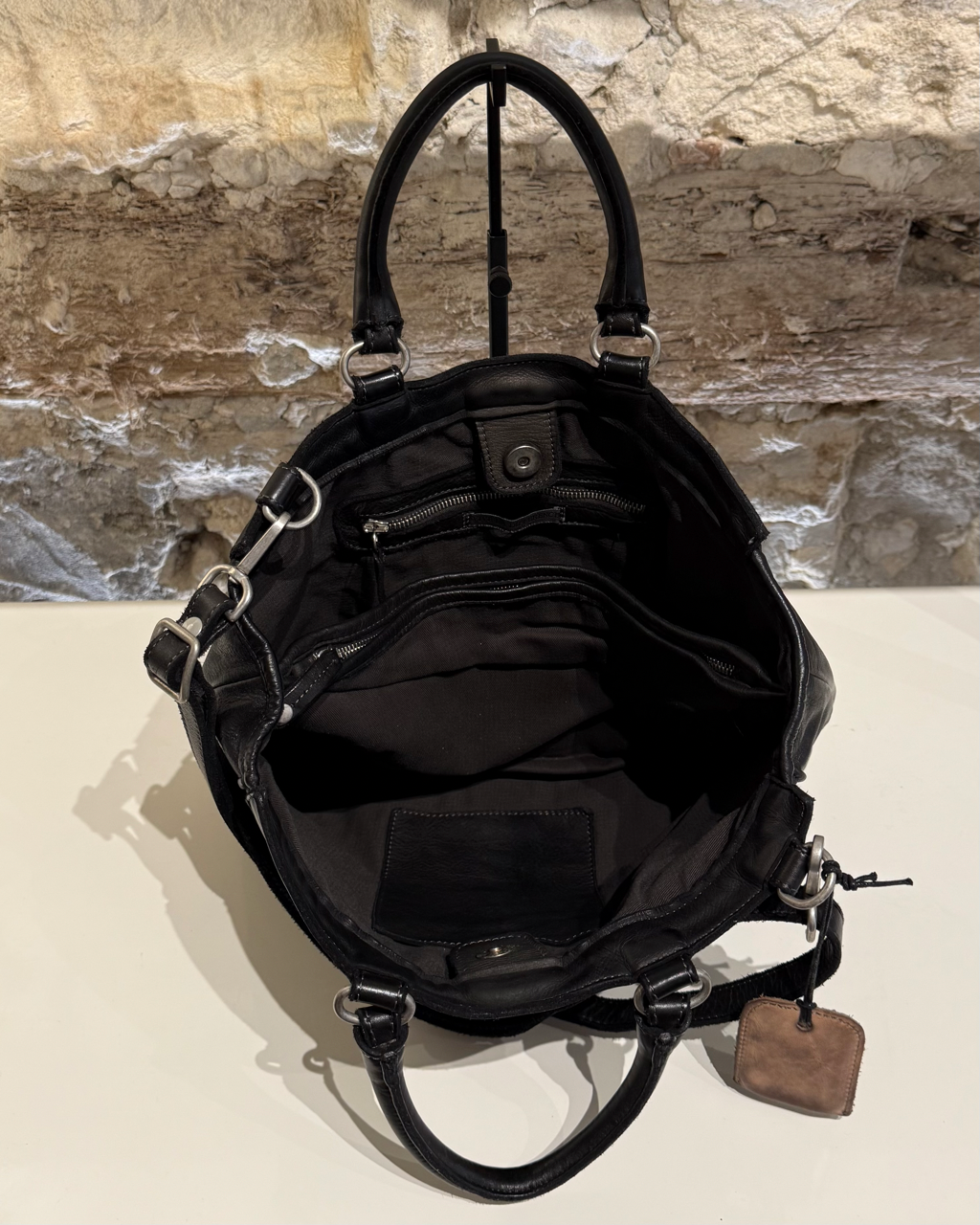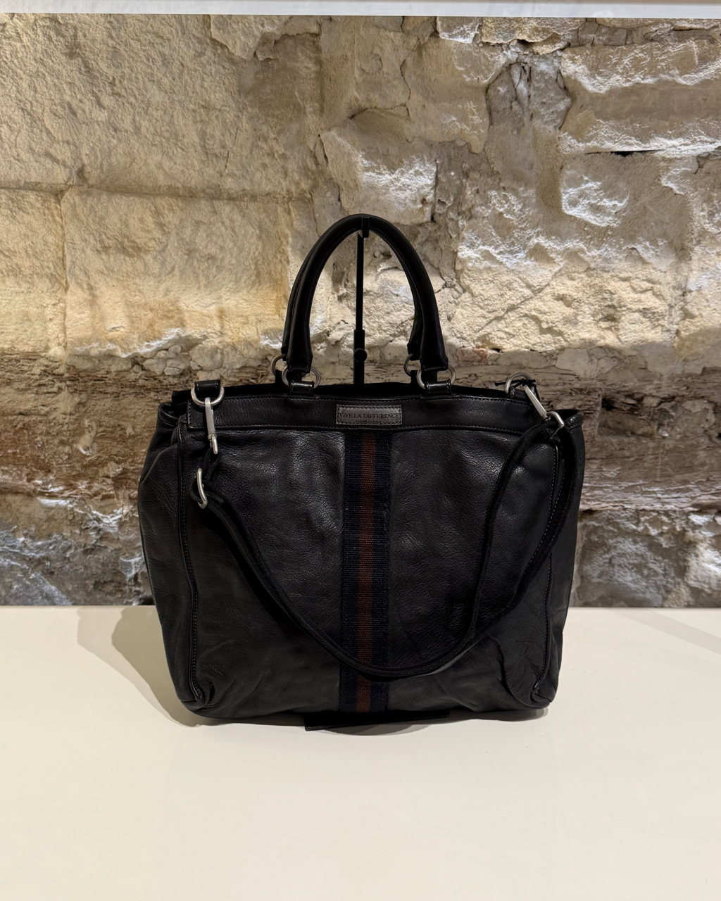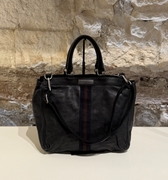 Ce modèle est en cuir de veau avec une doublure en tissu pied de poule, et une bande de tissu surpiquée. Il présente trois poches intérieures, dont l'une avec fermeture zippée, et se ferme par un bouton pression. Il présente deux anses et une bandoulière retirable et ajustable qui mesure environ 85 cm. Le tout fabriqué en Italie.